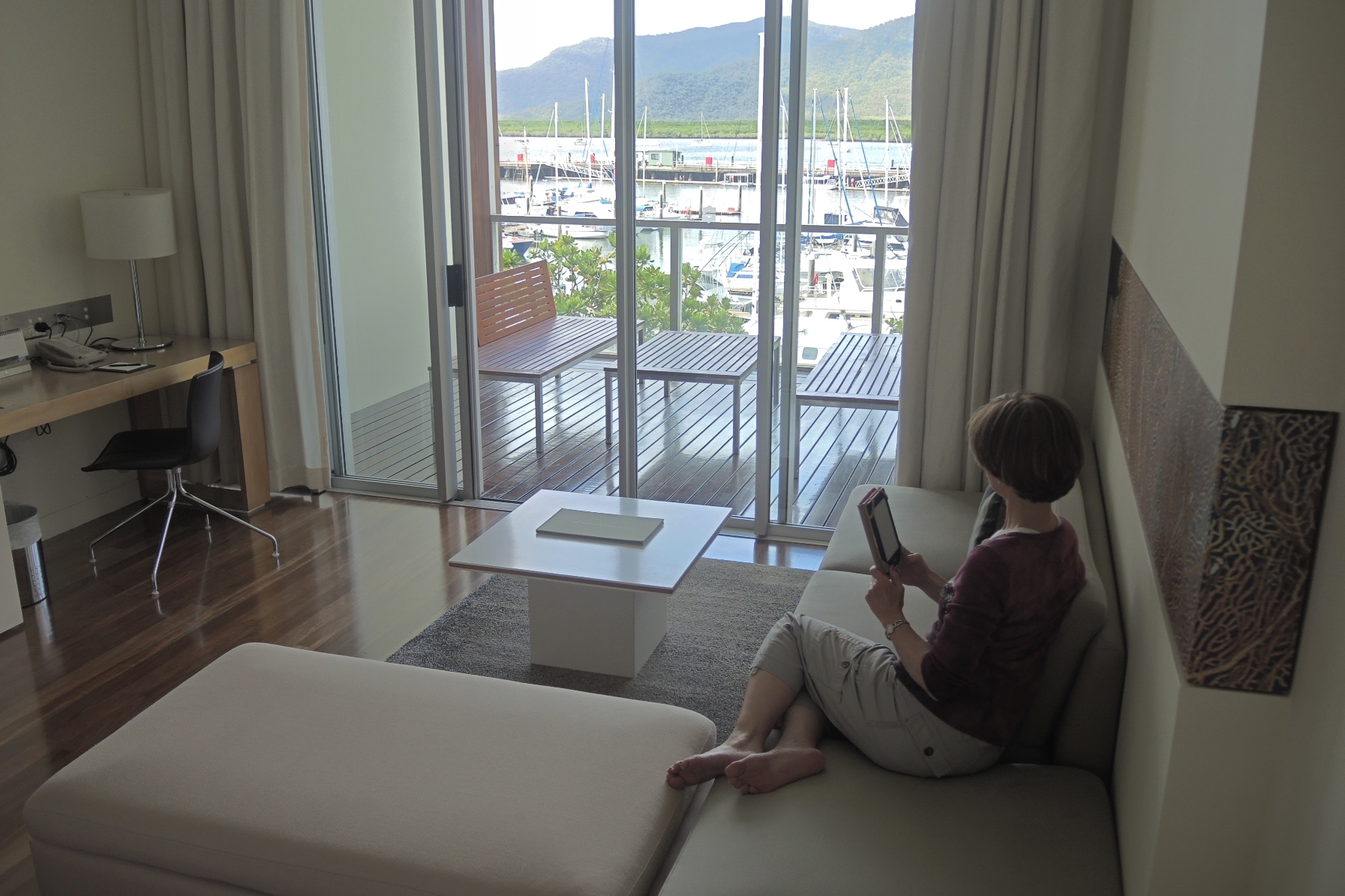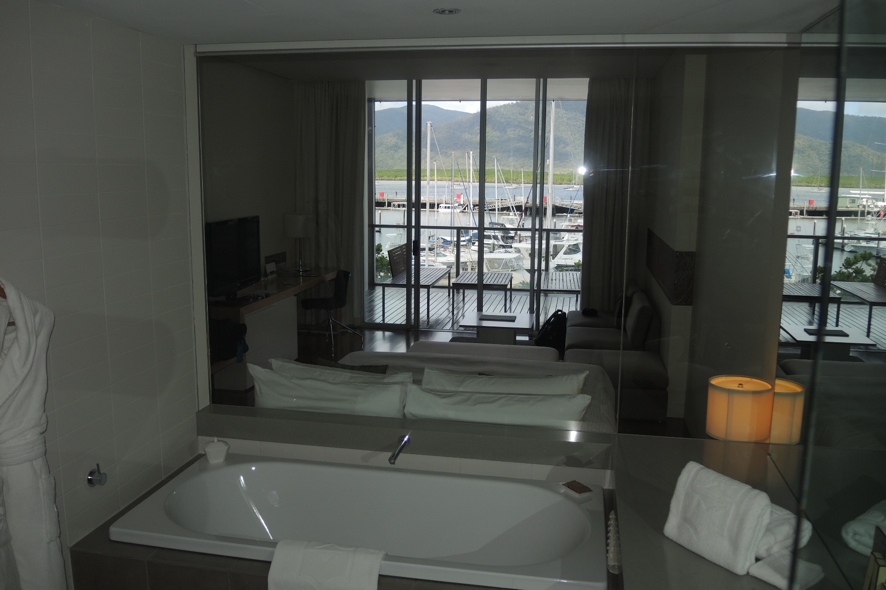 Airtime complete, our ride to the hotel was under fifteen minutes from the Cairns airport. Being a day of few plans and fewer expectations, the hurdle was low to make us happy: the hotel room did it! We were the first occupants of a renovated room on a special floor with modern features. For the most part I think photos will give you the flavor of the experience.