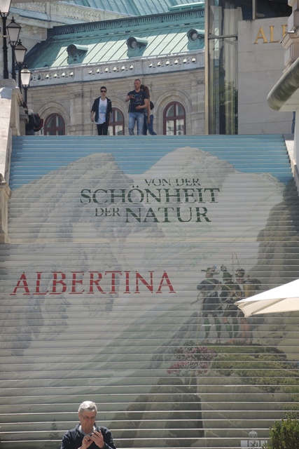 Art can be old or new; it resides above, beside, or below you; it is everywhere you look in Vienna. In this case the outdoor stairwell of the Albertina Museum complex has been made a canvas for a painting about paintings of an upcoming exhibit.