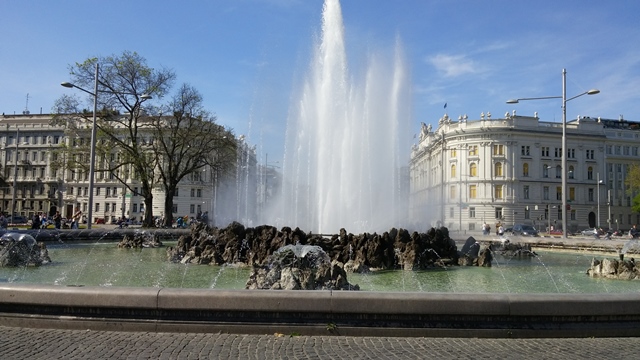 The excitement of a powerful fountain near a war memorial on Schwarzenburg Platz (Square) captures our attention. The view from one side contains a rainbow dancing on the drops of mist. This chosen angle shares the brilliance of the jetting water against a blue sky, flanked by non-identical but clearly symmetrical white buildings that shine in the same sun that creates rainbows.
