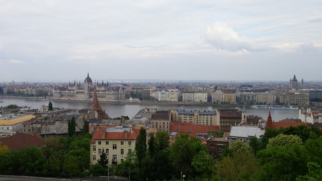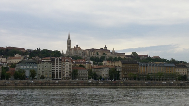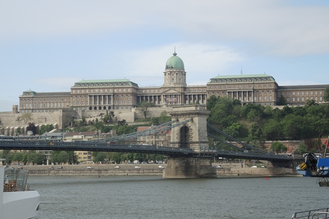 From edge of the Buda-side hill one is treated to views of the Budapest Parliament, beyond which the Pest side of the city stretches without any undulation, in contrast to the hills featured on the Buda side. The Danube River splits them, with our blue and white MS River Rhapsody moored just blocks from the Parliament.