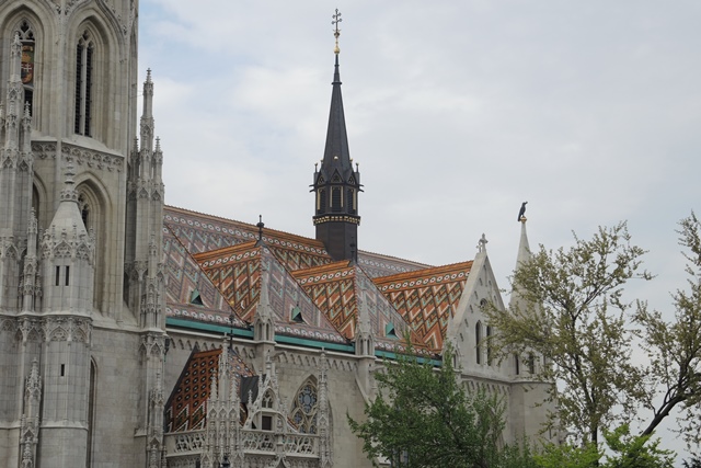 We explore the outside of the St. Matthias Church (English spelling), noting its ornate roof and also the signature black raven of this Hungarian King and Saint on a smaller spire appropriately positioned at the treetop. We wonder if that bird’s color is the inspiration for the black tower as well.