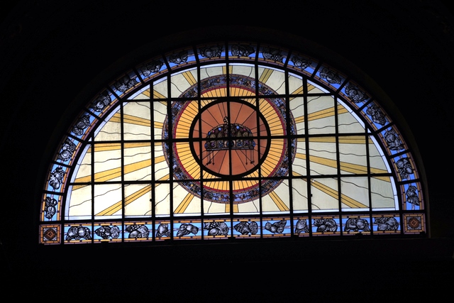 A stained window exhibits a central image of the crown worn by kings beginning over 1000 years ago; we will see the well-guarded genuine crown in the Parliament later today.