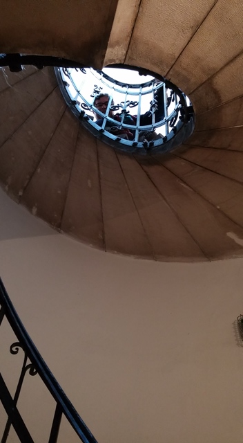 <p class="wp-caption-text" style="font-size:100%;font-weight:bold;padding:2px 0 7px;"Peering through the rails of the circular staircase that winds up at the rooftop for 360-degree views over all Budapest.