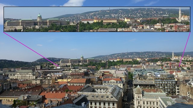Emerging above the city rooftops of the Pest side, we delight in 360-degree views from atop the church. Our eyes are level with castle hill, Buda side.