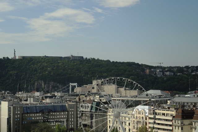 The Ferris wheel, viewed from St. Stephen’s rooftop, would be another way to see over Budapest. We note also that soaring off the hillside beyond is the Liberation Monument that we see day and night from the river.