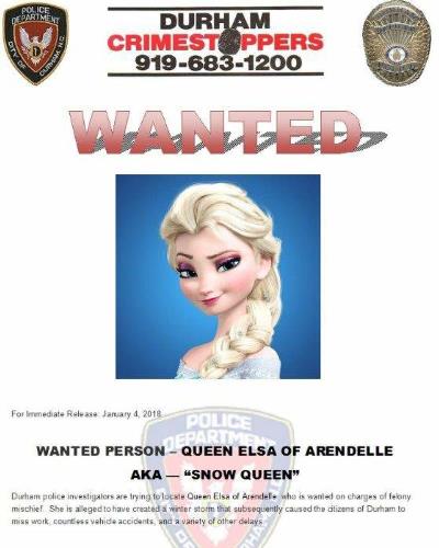 A local PD “wanted” into the Frozen act during a January cold spell in North Carolina. Clever!
